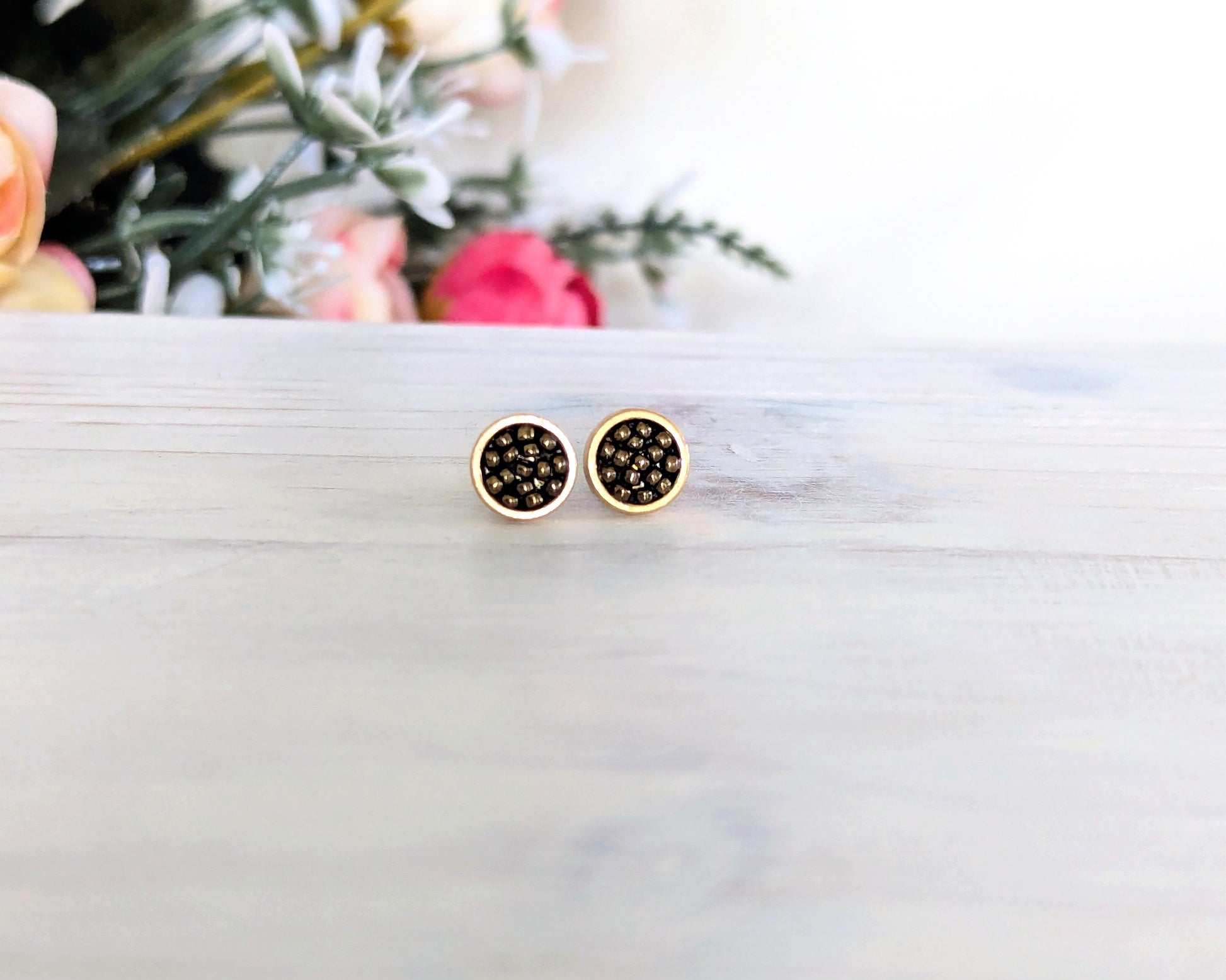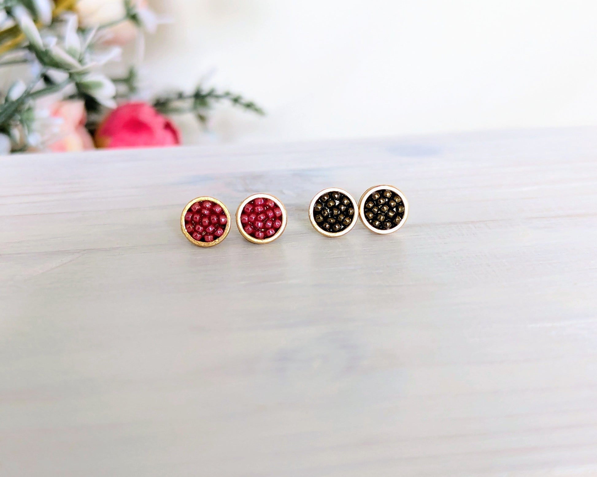 These adorable stud earrings are small, lightweight, and filled with colorful Miyuki beads in charming red and brown. They add a delicate pop of color to any outfit, perfect for everyday wear.